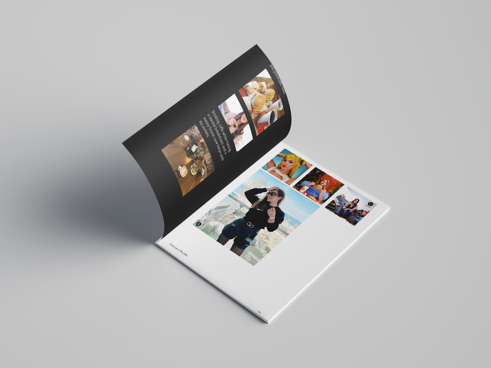The magazine is featured around a mobile phone screen, it shows a 3 column grid like that found on Instagram and on the right is designed to look like a phone screen being scrolled up which is why most of the top images are cropped out of the page.